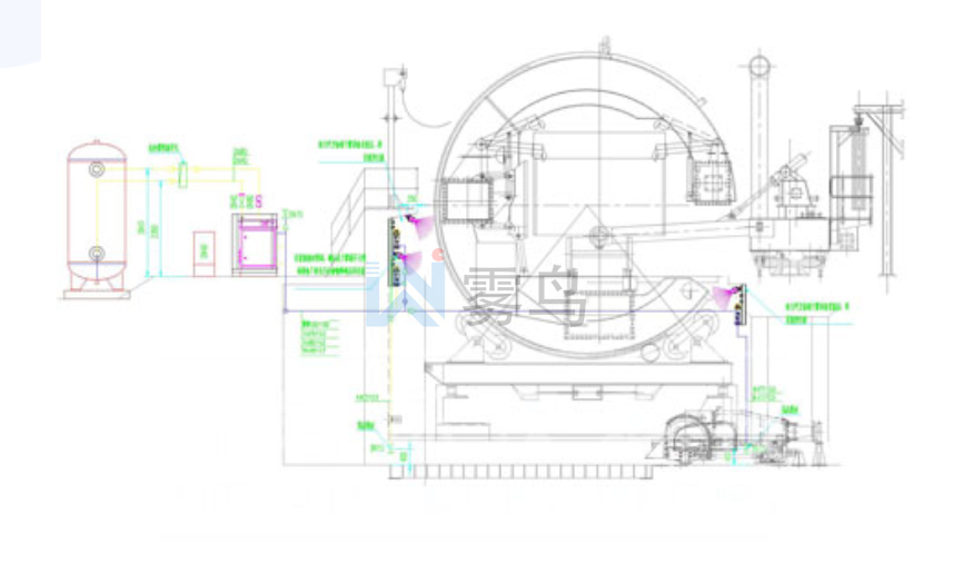 翻車(chē)機(jī)的微米級(jí)干霧抑塵系統(tǒng)由水箱、多級(jí)過(guò)濾恒壓供水站、空氣壓縮機(jī)、儲(chǔ)氣罐、微米級(jí)干霧抑塵主機(jī)、干霧箱控制器、噴霧箱、霧化管道、集中控制系統(tǒng)、配電箱等組成。 在翻車(chē)機(jī)傾翻側(cè)上面安裝5套ST2-7-60干霧箱總成,1套STK-A干霧箱控制器,1套STK-W干霧箱控制器,在傾翻側(cè)下面安裝3套ST2-7-60干霧箱總成,1套STK-A干霧箱控制器,1套STK-W干霧箱控制器,在背翻側(cè)設(shè)計(jì)安裝6套ST2-7-60干霧箱總成和1套SKT-A干霧箱控制器、1套SKT-W干霧箱控制器,干霧箱總成噴霧時(shí)間30s,周期2min。