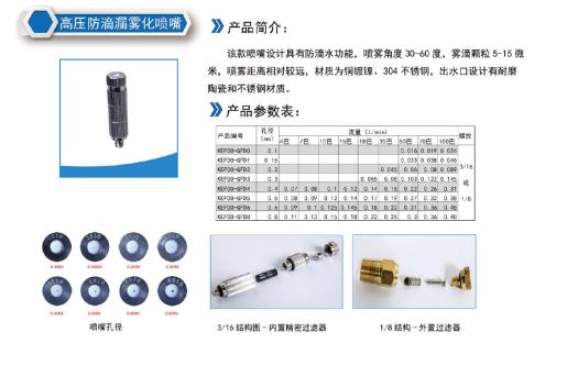 噴嘴選用:選用導(dǎo)流片式噴嘴,內(nèi)置精密過濾器,噴霧霧滴細(xì)小5-15um,工作壓力40-80公斤,流量60ml/min